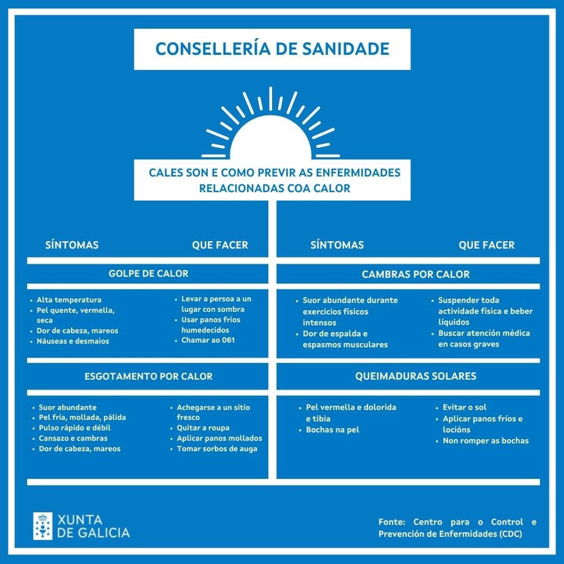 La Xunta ha reiterado los principales consejos que se deben seguir ante la subida de temperaturas prevista para esta semana en toda Galicia, recomendaciones que se centran, fundamentalmente, en la alimentación y en la exposición al sol.