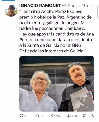 "Les habla Adolfo Pérez Esquivel premio Nobel de la Paz. Argentino de nacimiento y gallego de origen. Mi padre fue pescador en Combarro. Hay que apoyar la candidatura de Ana Pontón como candidata a presidenta a la Xunta de Galicia por el BNG. Defiende los intereses de Galicia", ha posteado en la red social X el Nobel argentino, a través de cuenta de Ramonet.