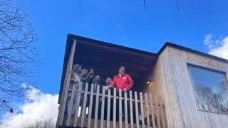 El candidato del PSdeG a la presidencia de la Xunta, José Ramón Gómez Besteiro, asomado al balcón de una de las cabañas del glamping Cabanas das Chousas en su último acto de campaña en Lugo. En Lugo, a 16 de febrero de 2024. - EUROPA PRESS