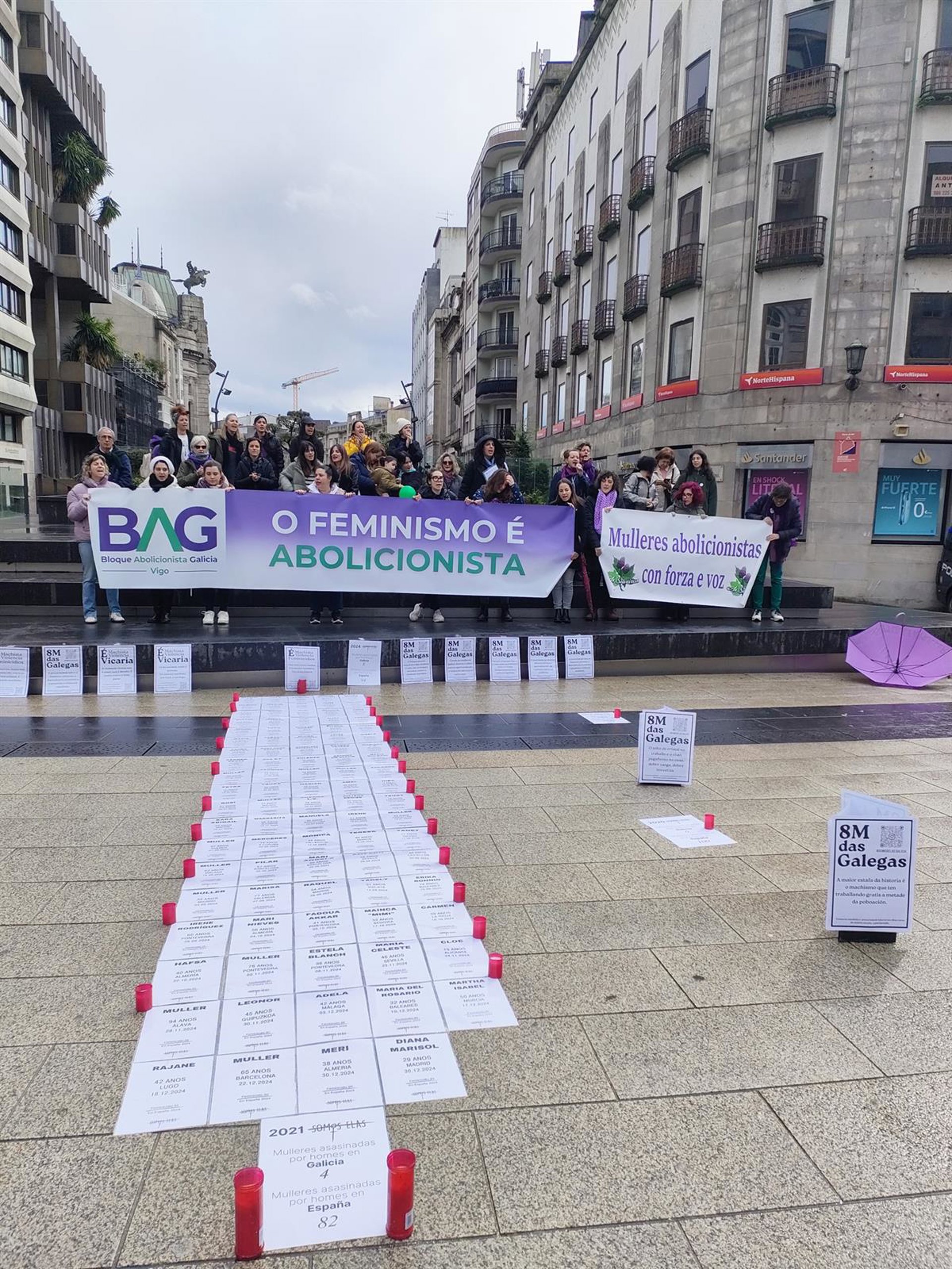 Concentración de mujeres convocadas por entidades del llamado bloque abolicionista del feminismo, en la Porta do Sol de Vigo, con motivo del 8M. - EUROPA PRESS