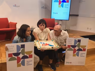 Varias generaciones representadas en estas tres personas --Lois Diéguez, María Alonso y Ana Pontón-- se juntaron este miércoles para soplar la vela del 50 aniversario del 25 en una tarta de milhojas con el diseño de la bandera 'estreleira' (con la estrella roja) y presentar el cartel del Día da Patria, que protagoniza un símbolo de más compuesto por varias figuras de distintos colores que representan la diversidad.