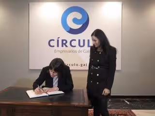 La candidata del BNG a la Presidencia de la Xunta, Ana Pontón, firma en el libro de visitas del Círculo de Empresarios antes de participar en el coloquio - EUROPA PRESS
