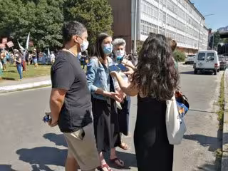 La diputada electa del BNG Olalla Rodil da declaraciones a los medios en una protesta de los sindicatos contra el protocolo de la Consellería de Educación para el próximo curso escolar - BNG