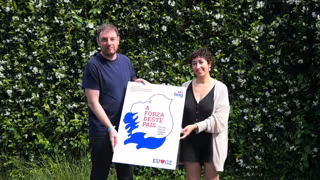 La responsable de Organización, Lucía López, y el responsable de Comunicación, Xavier Campos, del BNG, presentan el lema de la formación para el 25 de julio. - BNG