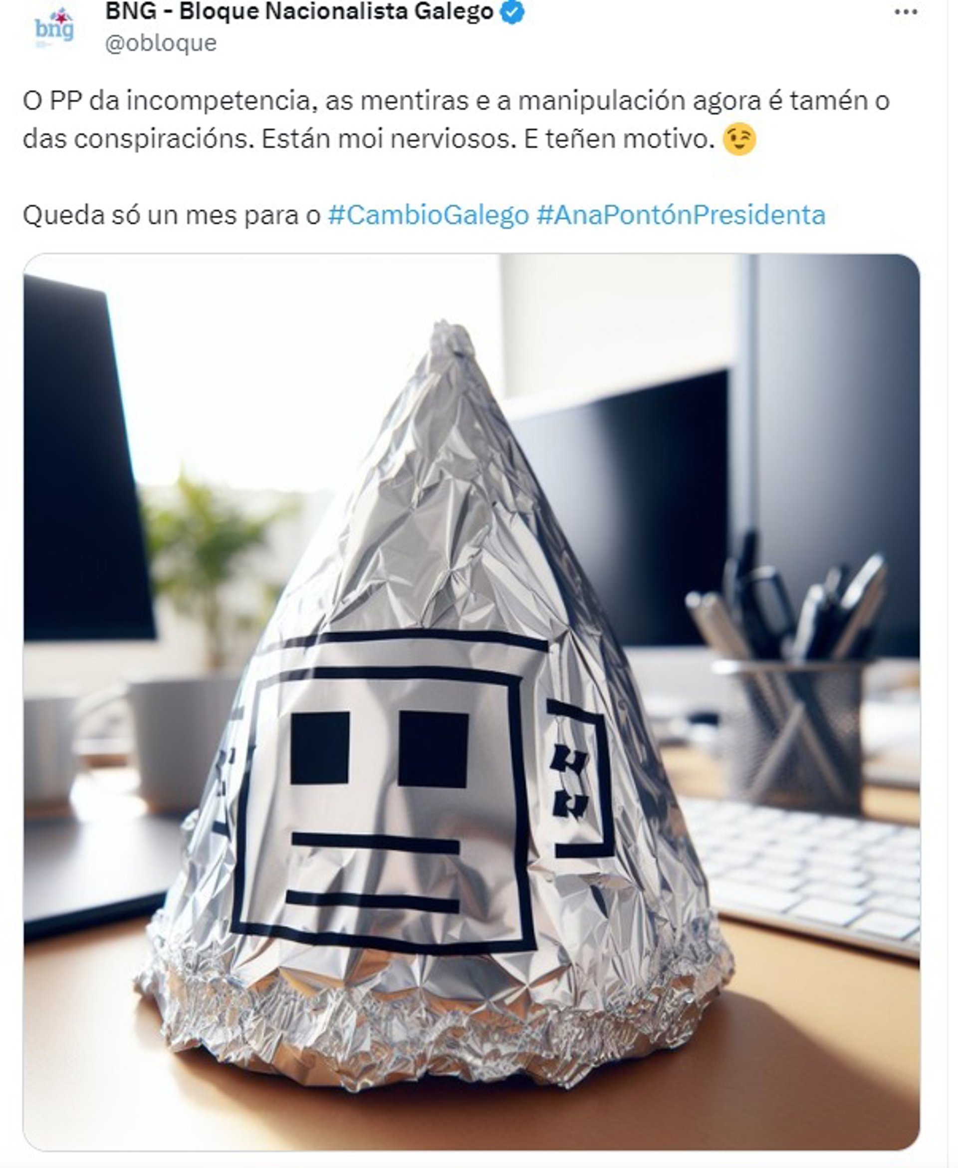 "El PP de la incompetencia, las mentiras y la manipulación ahora es también el de las conspiraciones. Están muy nerviosos. Y tienen motivo", ha posteado la cuenta oficial del BNG.
