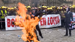 Centenares de bomberos comarcales en huelga se manifestaron por las calles de Santiago el pasado viernes en una movilización que terminó en la Praza do Obradoiro con uno de ellos quemándose a lo bonzo. Esta 'performance' contó con dos miembros disfrazados del presidente de la Xunta, Alfonso Rueda, y del director xeral de Emerxencias, Santiago Villanueva, que fueron los encargados de prender fuego a un hombre vestido con traje ignífugo.