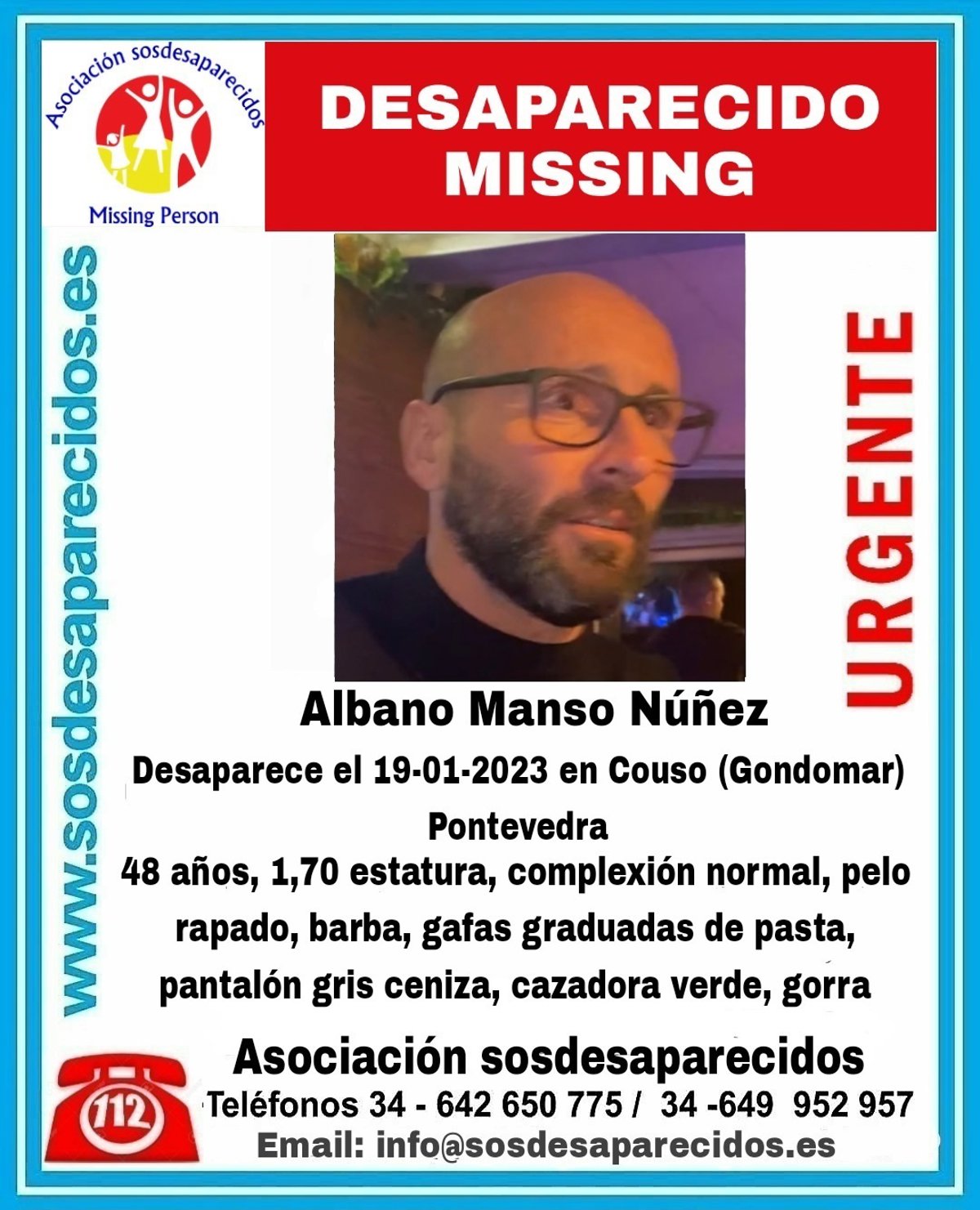 El Varón, Albano M.N., tiene el pelo rapado, barba y lleva gafas de pasta. Familiares y amigos del hombre han iniciado una campaña en las redes sociales solicitando ayuda para dar con su paradero.