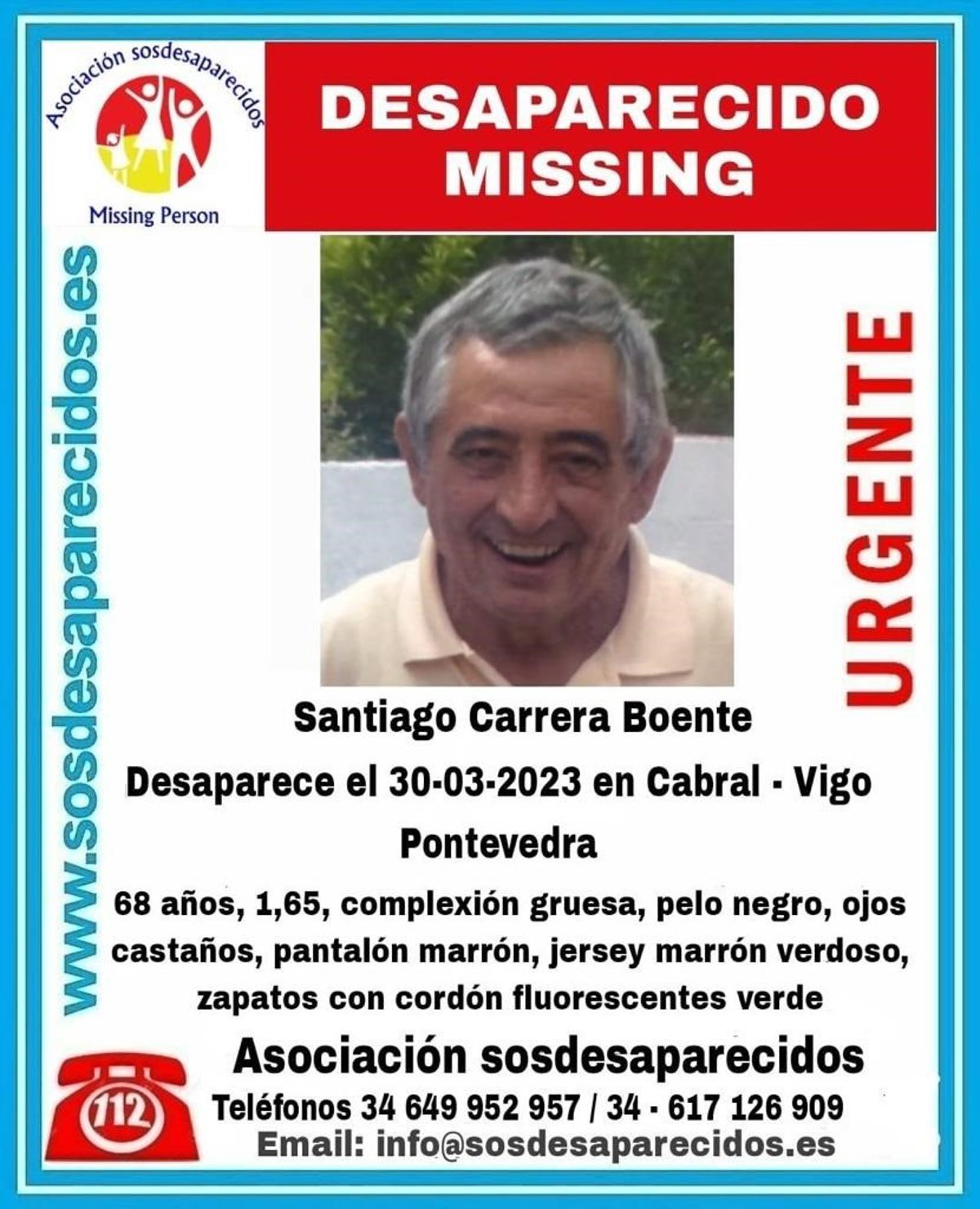 Santiago Carrera Boente, hombre de 68 años desparecido en Vigo el 30 de marzo de 2023 - SOS DESAPARECIDOS