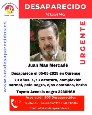 El hombre al que se busca es Juan Mas Mercadé, a quien la asociación SOS Desaparecidos identifica como un varón de 1,73 metros de estatura, complexión normal, pelo negro, ojos castaños y barba. Fue visto por última vez en el municipio de Taboadela.