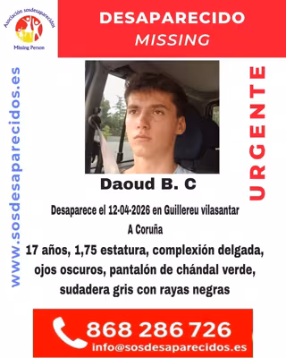 SOS Desaparecidos ha solicitado ayuda ciudadana este lunes para encontrar a Daoud B.C, un joven de 17 años que permanece desaparecido desde el domingo, 12 de abril, en A Coruña.