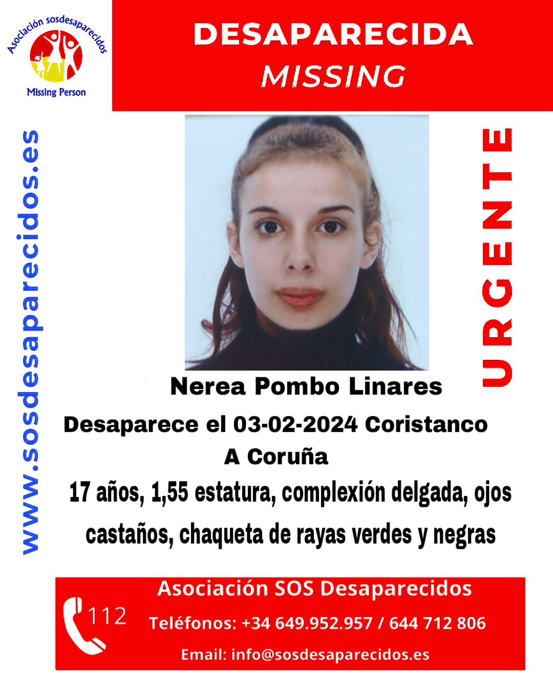 Se trata de Nerea Pombo Linares, una joven de 1,55 de estatura, complexión delgada, ojos castaños y que vestía chaqueta de rayas verdes y negras.