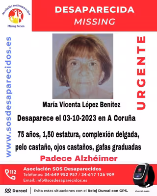 Según la información proporcionada por la entidad, la desaparecida es María Vicenta López Benítez, una mujer de 1,50 metros de altura, compexión delgada, pelo y ojos castaños y gafas graduadas. La mujer padece Alzheimer.