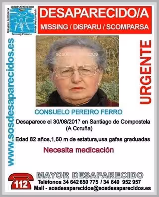 En concreto, según la alerta de SOS Desaparecidos difundida por la Guardia Civil en redes sociales, se trata de Consuelo Pereiro Ferro, de 82 años de edad, que mide 1,60 metros y usa gafas graduadas.