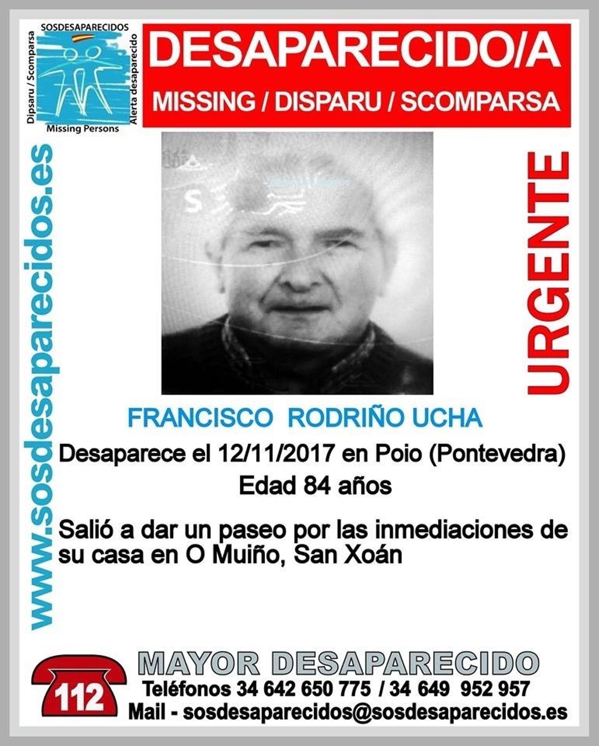 Un portavoz de Protección Civil ha explicado a Europa Press que, sobre todo durante las tardes, se realizarán búsquedas en los próximos días con el fin de averiguar el paradero de Francisco Rodriño Ucha, de 84 años, que salió a las 17,00 horas del domingo día 12 de noviembre a dar un paseo por las inmediaciones de su casa en O Muiño, San Xoán de Poio.