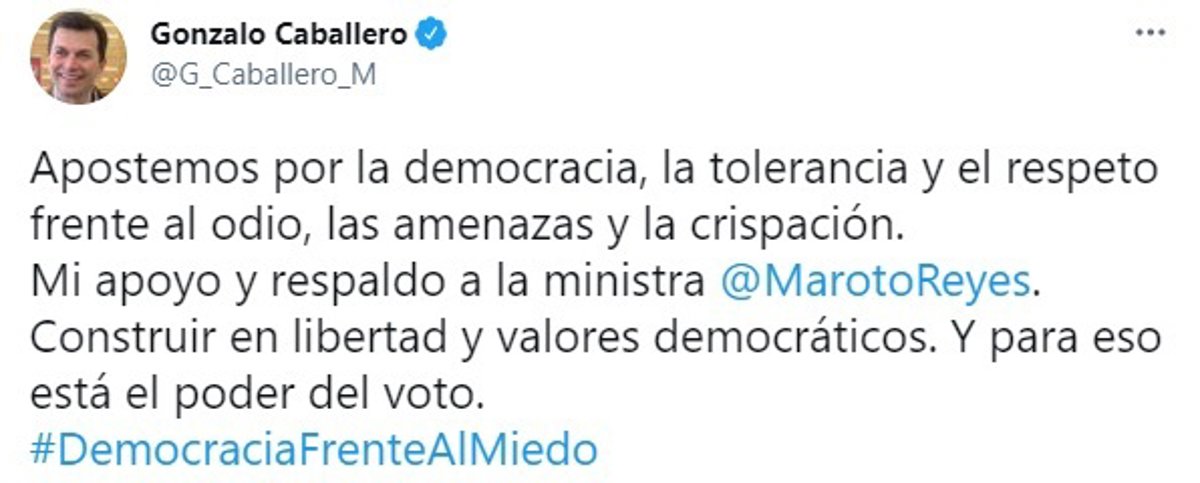 @MarotoReyes", señala el mensaje que finaliza llamando a "construir en libertad y valores democráticos". "Y para eso está el poder del voto. #DemocraciaFrenteAlMiedo", finaliza.