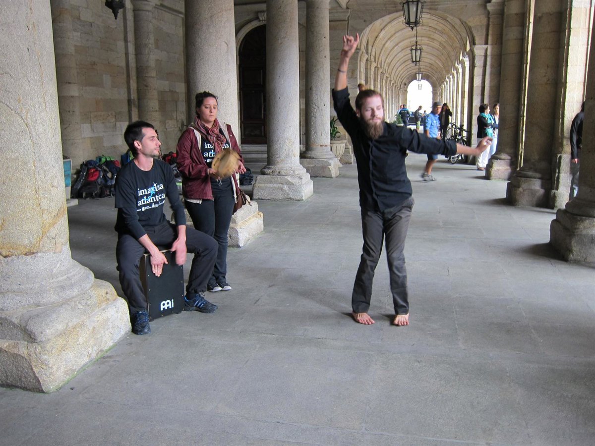 Una vez finalizada la comparecencia de prensa, un grupo de artistas participantes en 'Teatros de Pedra' han realizado una exhibición en los soportales del Pazo de Raxoi.