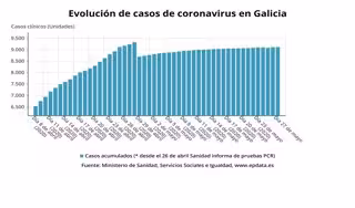Evolución de casos de coronavirus en Galicia hasta el 27 de mayo de 2020, según datos del Ministerio de Sanidad. - EP DATA