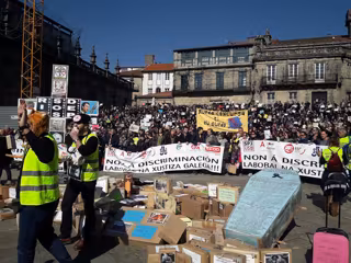 Entre cánticos de 'No a la discriminación' y vestidos mayoritariamente de negro como señal de "luto" por la "muerte" de la justicia gallega, los participantes han reclamado "igualdad" pero también "dignidad", con maletas ficticias como protagonistas, en referencia a la supuesta invitación a "emigrar" que les habría realizado el director xeral de Función Pública en el marco de las negociaciones.