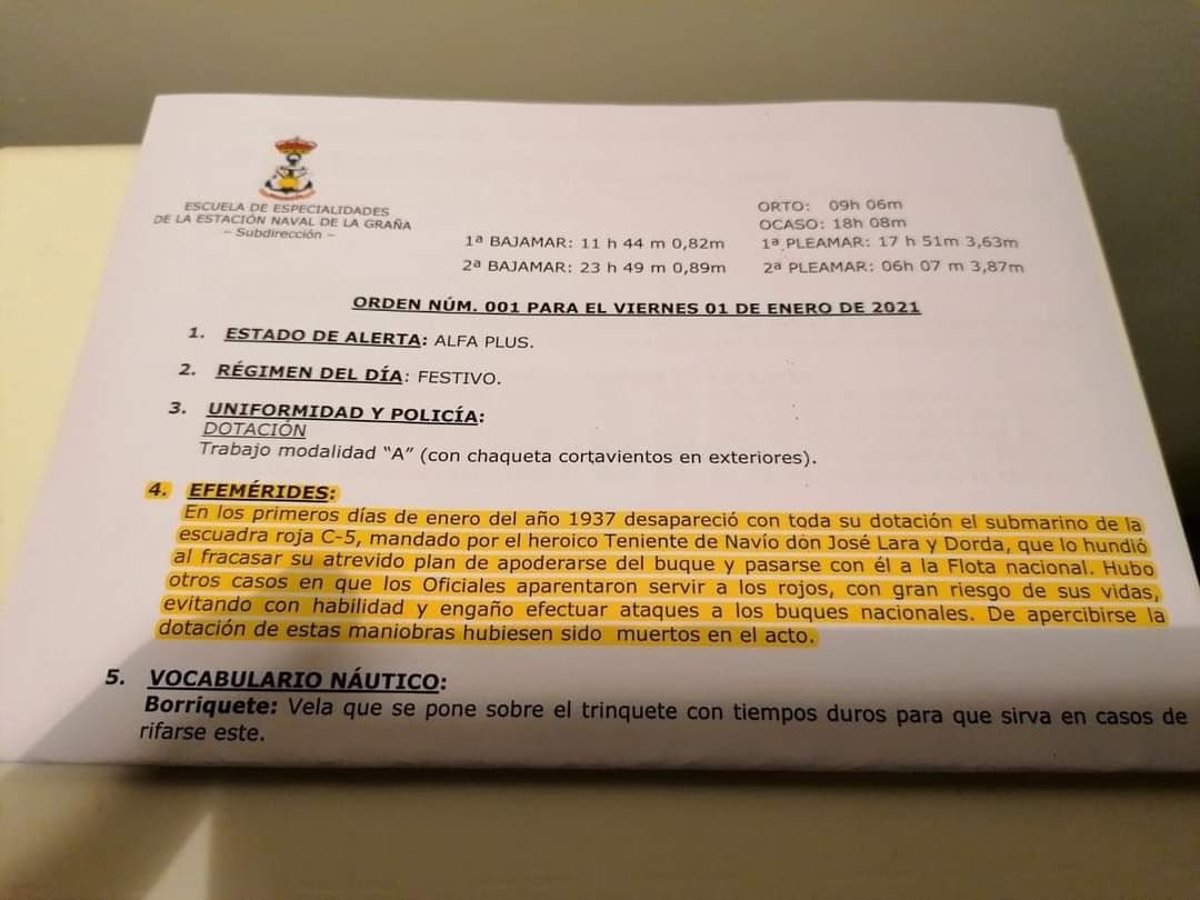 El Bloque se hizo eco de un documento oficial, difundido a través de las redes sociales, con una orden del día que en el apartado de 'efemérides' recuerda el hundimiento del submarino 'C5' de la llamada "escuadra roja", con un "lenguaje propio de la Guerra Civil y del franquismo", indicó la formación.