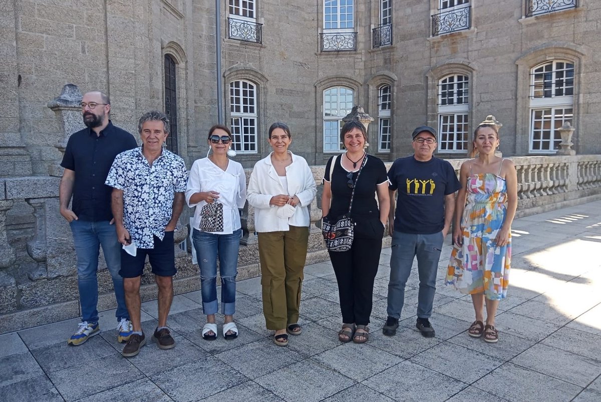 La concelleira de Acción Cultural del Ayuntamiento de Santiago de Compostela, Mercedes Rosón, junto a Xaquín López (Auditorio de Galicia) y los miembros de la compañía teatral Chévere. - CONCELLO DE SANTIAGO