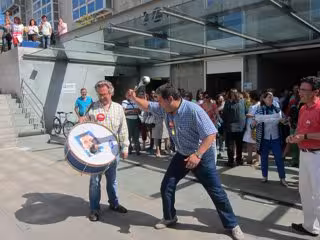 Entre las proclamas, las personas concentradas ante la cafetería de la Xunta gritaban: "Feijóo, escoita, estamos en loita" o "Manos arriba, esto es un atraco". Además, se produjeron pitadas y un grupo llevaba un bombo con una foto del presidente del Gobierno, Mariano Rajoy, que se iban pasado entre varios para golpear.