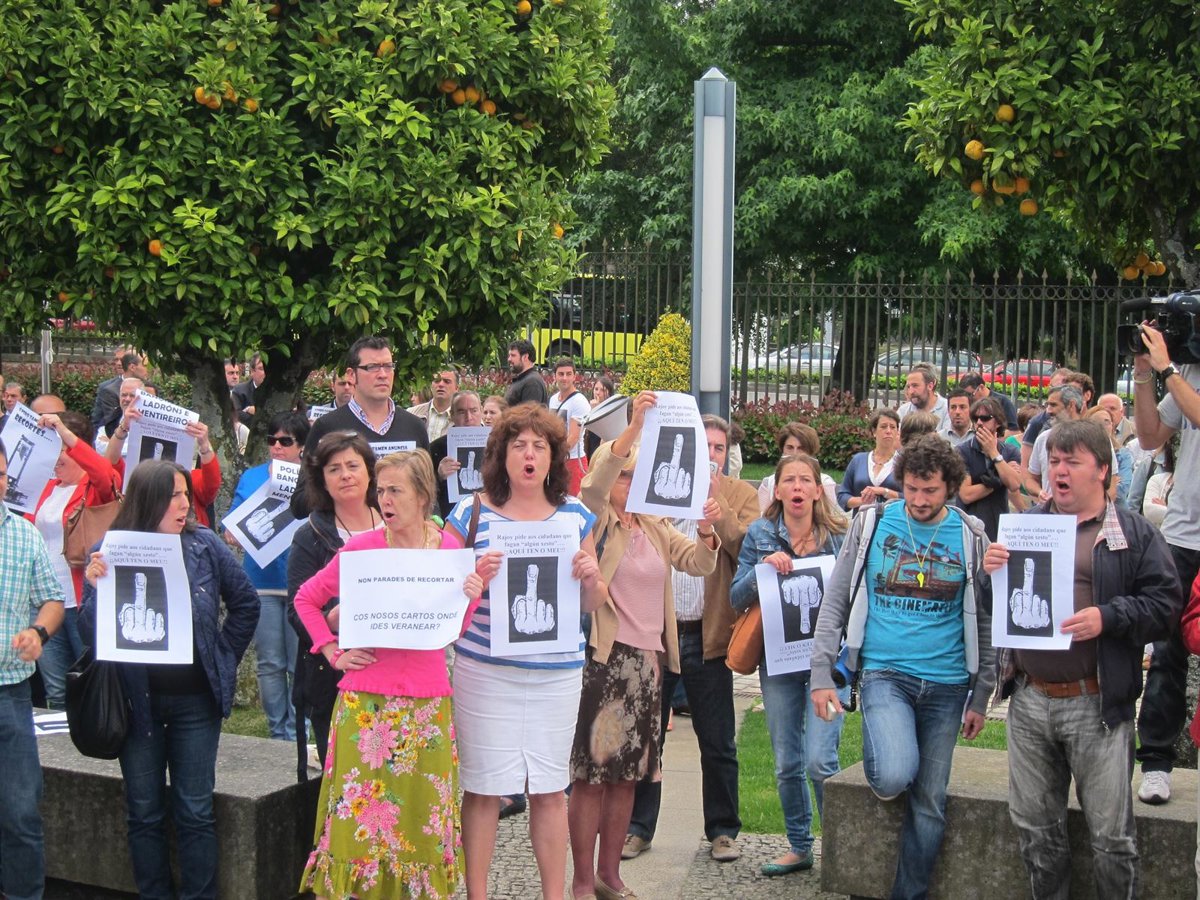 Muchos de los empleados públicos que este jueves se concentraron ante San Caetano portaban un cartel con el lema "Rajoy pide a los ciudadanos que hagan un gesto", acompañado de la imagen de un puño con un dedo corazón levantado. No obstante, también dirigieron sus llamadas de atención al presidente gallego, a quien reclaman "explicaciones" por los nuevos recortes, pese a la aprobación a principios de año de una ley que ya reguló medidas de ajuste que se aplican a los 90.000 empleados públicos de Galicia.
