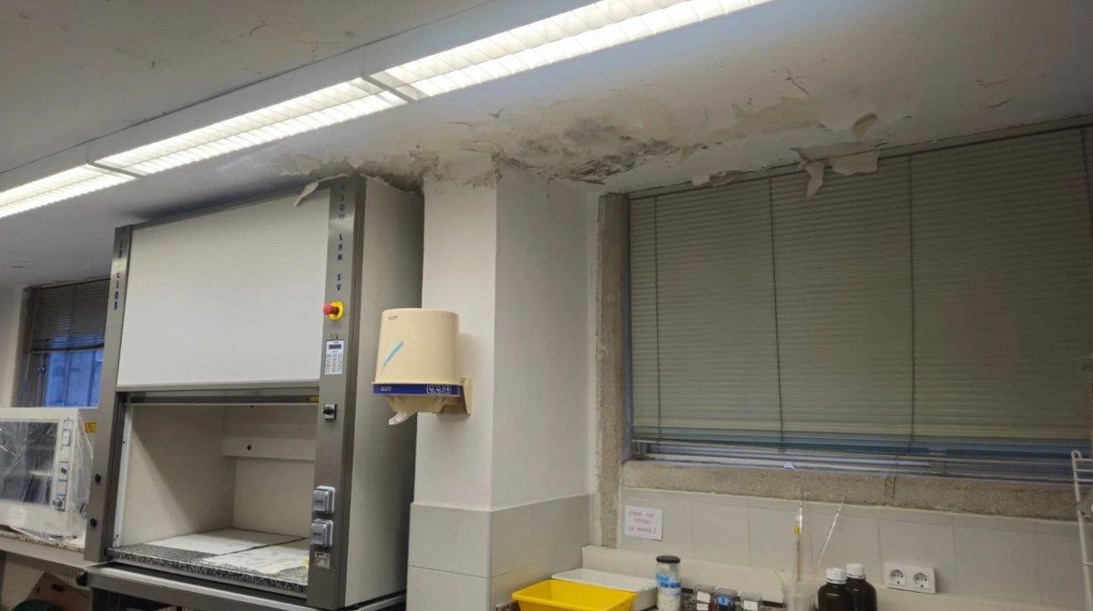 "Los problemas debido a las filtraciones de agua son perceptibles en todo el centro. Así, en el comedor de hostelería, en las aulas, en los laboratorios y en los talleres de todos los departamentos hay goteras y filtraciones, con charcos en las entradas de aulas de la planta baja del edificio central", critican.