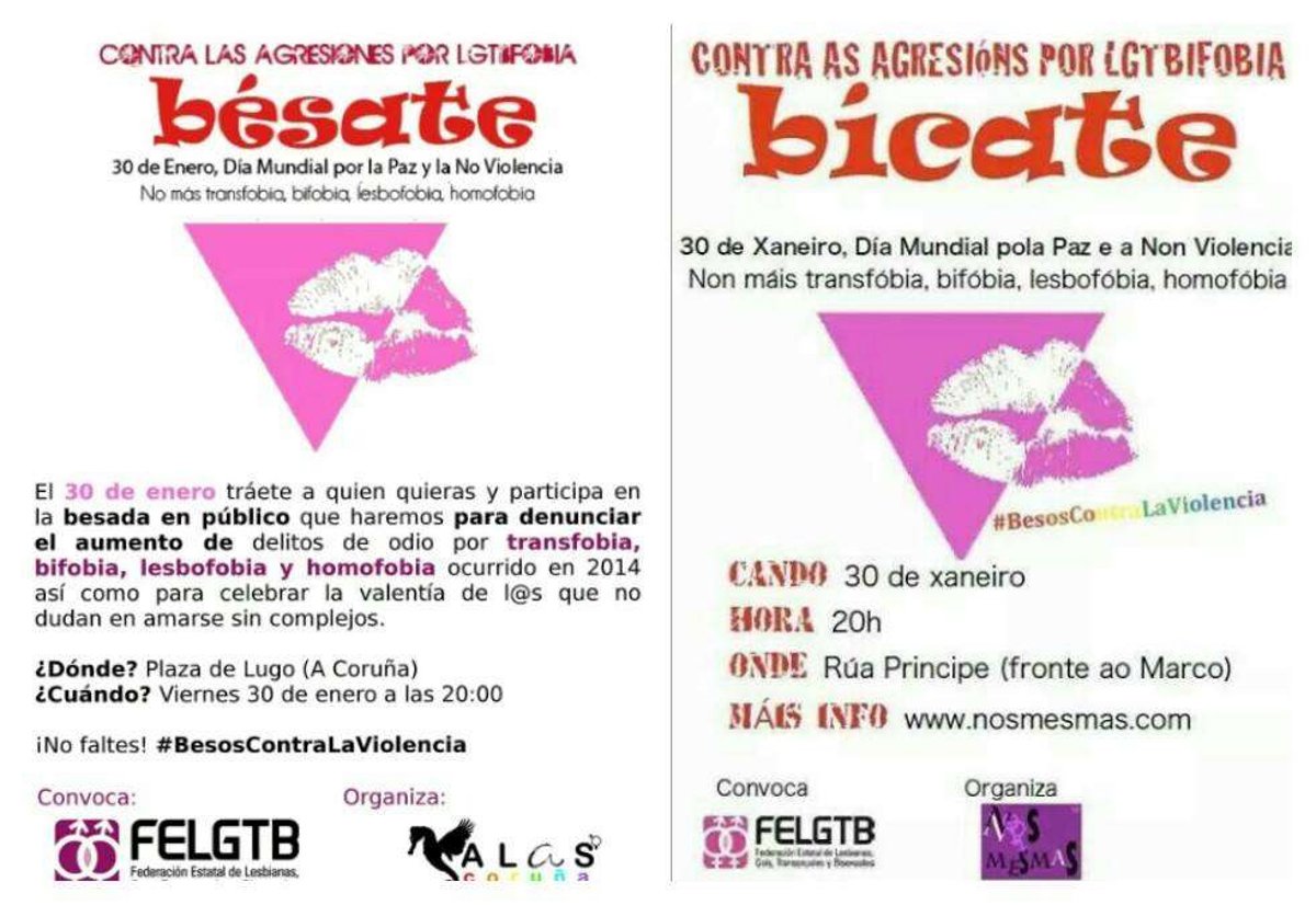 Las asociaciones Nós Mesmas, de Vigo, y A.L.A.S., de A Coruña, --ambos colectivos de la comunidad Lesbiana, Gay, Transgénero, Bisexual e Intersexual (LGTBI)-- participarán este viernes en la 'besada' conjunta convocada en 15 ciudades españolas para mostrar su rechazo a las agresiones y la discriminación por razón de género o identidad sexual.