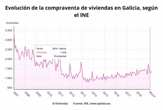 Galicia registró en marzo un total de 1.324 compraventas de viviendas, lo que supone un 5,4% más que en el mismo mes de 2018, según los datos que publica este martes el Instituto Nacional de Estadística (INE).
