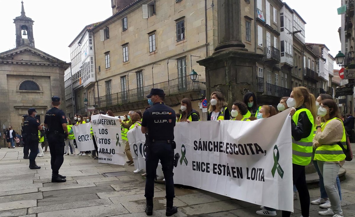 Decenas de empleadas de la factoría pontevedresa Ence se concentran a las puertas de un acto celebrado en Santiago en el que ha participado la vicepresidenta segunda del Gobierno, Yolanda Díaz, y el presidente de la Xunta, Alberto Núñez Feijóo - EUROPA PRESS