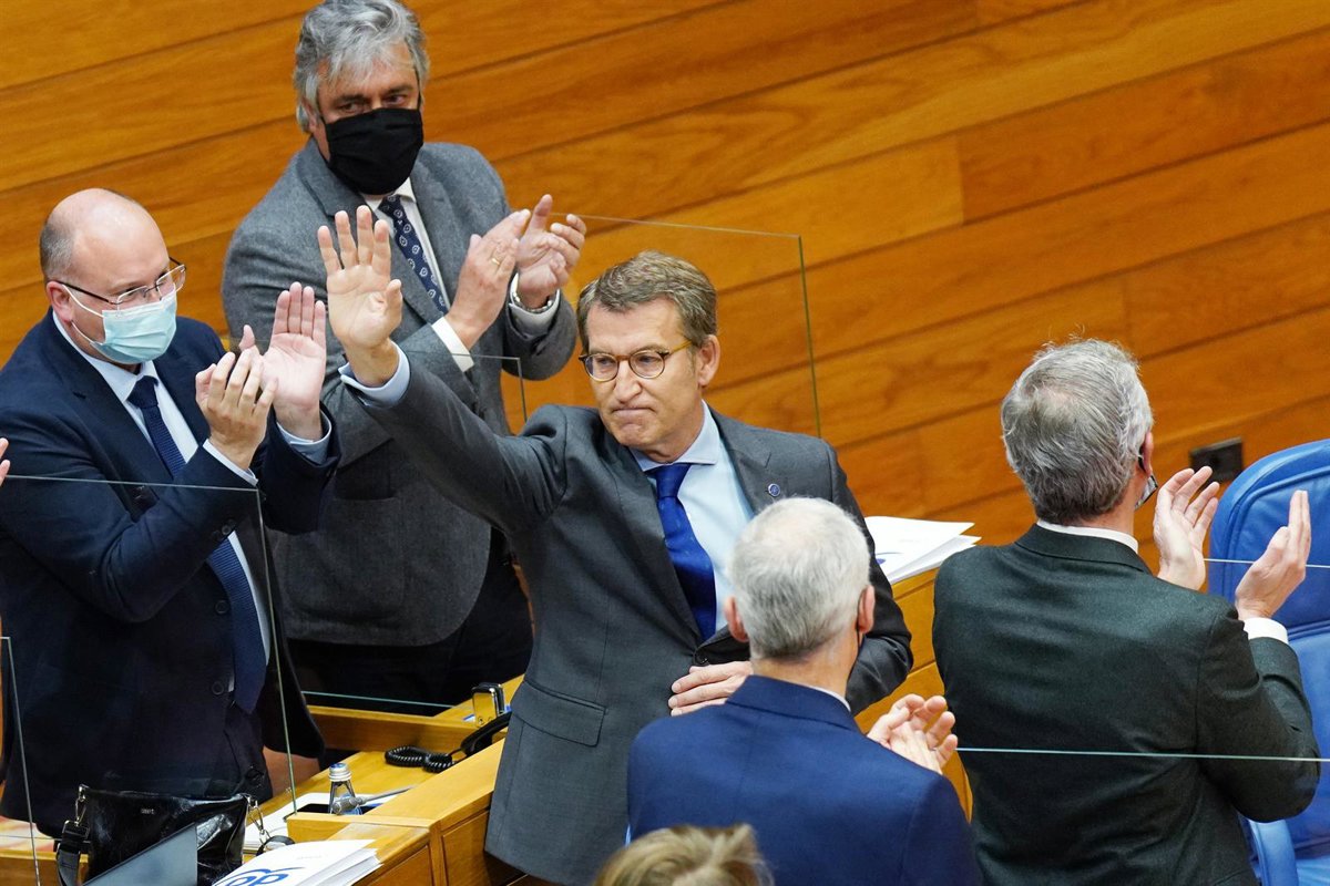 El presidente de la Xunta de Galicia, Alberto Núñez Feijóo (c), es aplaudido a su llegada a su última sesión de control, en el Parlamento de Galicia, a 27 de abril de 2022, en Santiago de Compostela, A Coruña, Galicia (España). - Álvaro Ballesteros - Europa Press