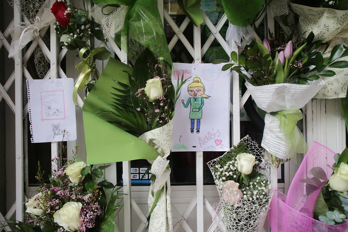 Un dibujo y varias flores colgadas en la tienda de alimentación donde trabajaba la mujer de 42 años muerta a cuchilladas en Lugo. - Carlos Castro - Europa Press