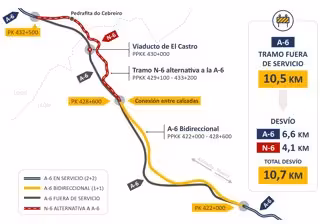 El itinerario alternativo para el tráfico sentido Madrid se realizará a través de la N-6 y A-6 entre los PP.KK. 432 a 422 de esta última, y estará convenientemente señalizado.
