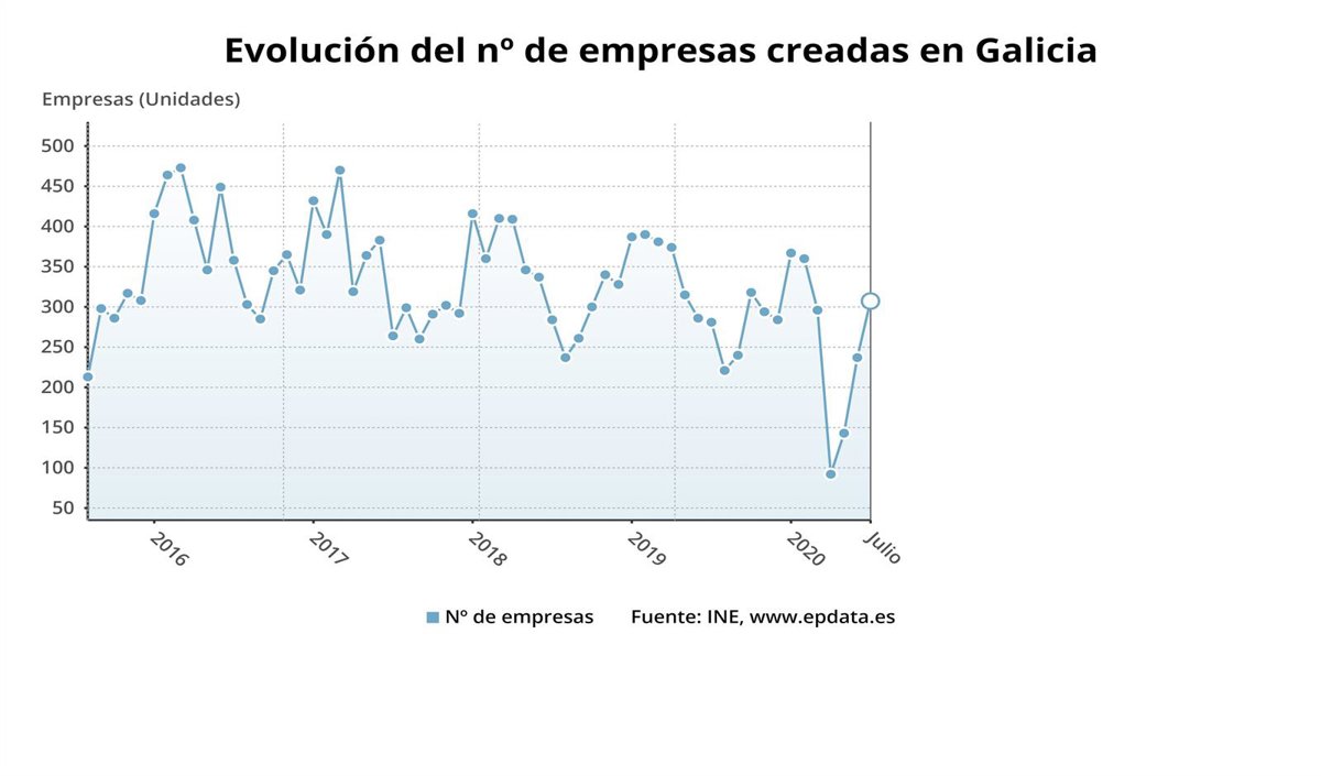 El número de nuevas sociedades mercantiles creció un 9,6% en julio en Galicia, hasta 308, mientras que las disoluciones bajaron un 30%, hasta 56, según los datos que publica este jueves el Instituto Nacional de Estadística (INE).