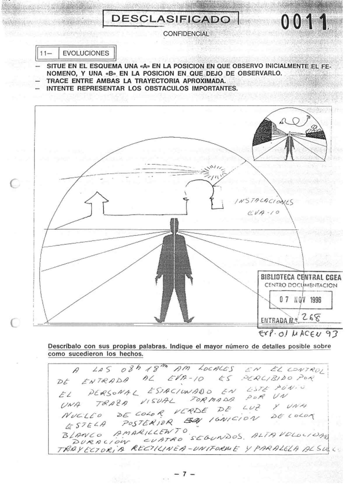 Además, se incluye un croquis realizado por el propio observador con las distintas fases de un objeto que se mantuvo durante unos 45 minutos en el cielo, del que describe su forma, color azulado, que estuvo a una altura de unos "200 metros" sobre el suelo.