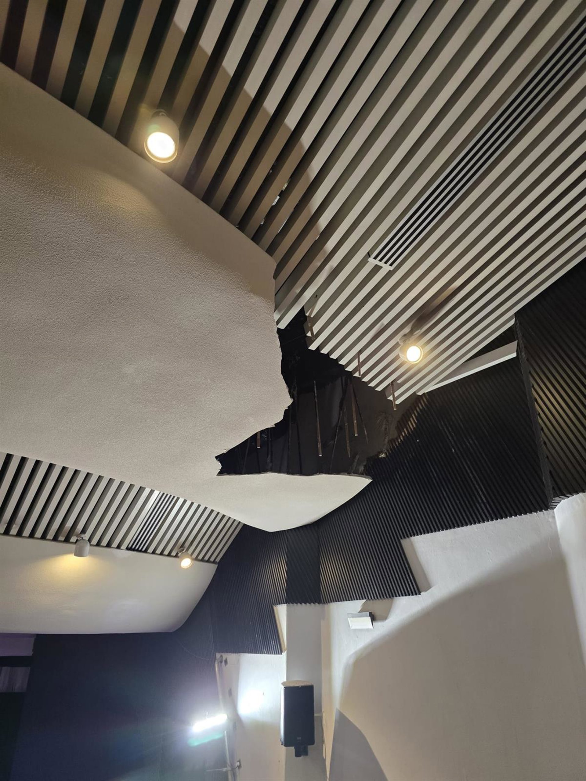 En un momento dado, alrededor de dos metros del falso techo del anfiteatro se desprendieron, cayendo sobre el público que había, presenciando el espectáculo.