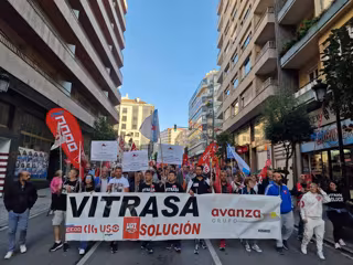 La manifestación iba encabezada por una pancarta que rezaba 'Vitrasa solución', firmada por los sindicatos CIG, UGT, USO y Comisiones Obreras (CC.OO.), convocantes de la protesta.