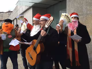 "Y ya estamos en diciembre, fun, fun, fun; no tenemos la extra completa, fun, fun, fun; va camino de Suiza, algo quedará en Andorra para las deudas de los bancos, a nosotros nos la llevan toda, fun, fun, fun", cantaron los funcionarios ante el registro general de la Administración, en que dejaron una carta dirigida al presidente de la Xunta junto a billetes de 200 falsificados para hacer ver que consideran la medida "de cara a la galería electoral".