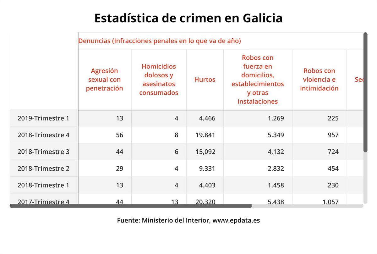 Con todo, desde la Delegación del Gobierno se incide en el aumento de delitos esclarecidos en Galicia, entre enero y marzo de este año. Además, remarca que esta Comunidad "continúa como cuarta más segura del Estado, con 29,6 infracciones penales por cada mil habitantes en el acumulado de los últimos doce meses, muy por debajo de la media estatal, situada en 46,2".