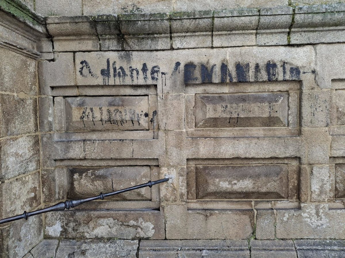 Esta pintada figura en la fachada del monasterio y anunciaba el lanzamiento del 'Adiante Semanario' casi un siglo atrás. Tras lo sucedido, una de sus palabras ha quedado emborronada en lo que el colectivo entiende como un "atentado contra el patrimonio histórico" y que el alcalde, Antonio Puga, también ha condenado.