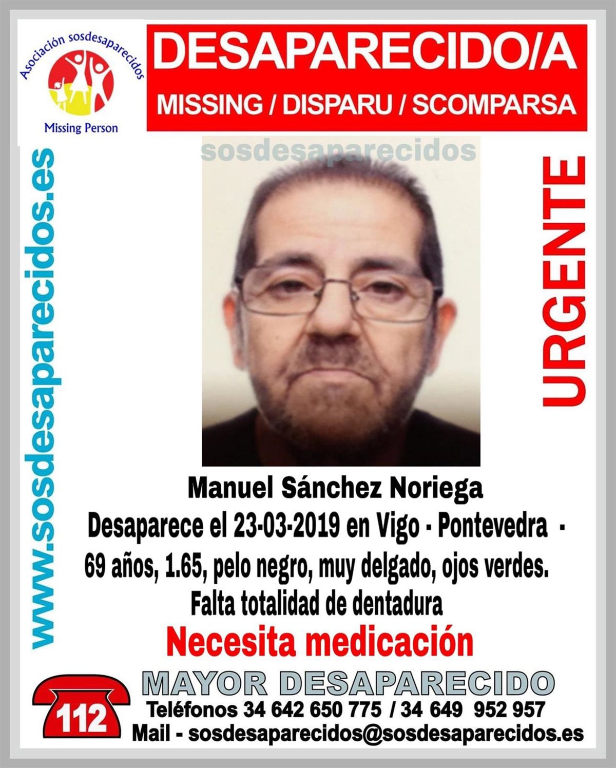 El desaparecido padece diabetes y precisa inyectarse insulina de forma diaria. SOS Desaparecidos también ha solicitado ayuda para localizarlo.