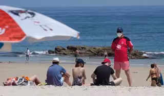 Varias personas protegidas con mascarillas toman el sol en la Playa de A Rapadoira en Foz, en la comarca de A Mariña. - Carlos Castro - Europa Press