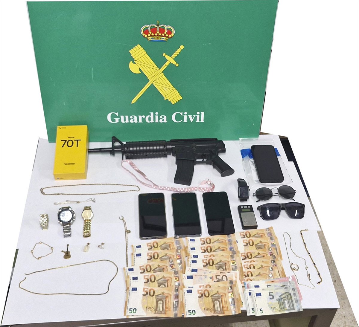 Igualmente, los agentes intervinieron unos 1.500 euros en metálico, un arma larga simulada, una báscula de precisión y tres teléfonos móviles.