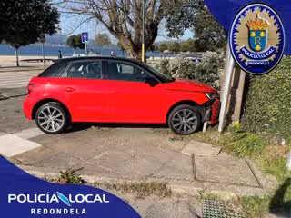 Coche accidentado en Redondela, cuyo conductor fue detenido por no tener carné, dar positivo en alcoholemia y agredir a su pareja. - POLICÍA LOCAL DE REDONDELA