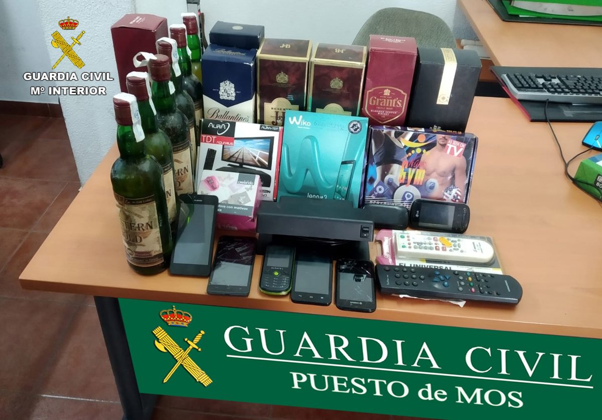 La Guardia Civil ha detenido a un vecino de O Porriño, de 29 años de edad, y a un vecino de Vigo, de 51 años, ambos con un amplio historial delictivo, como presuntos autores del robo de varias botellas de licor y teléfonos móviles en un domicilio de Mos (Pontevedra).