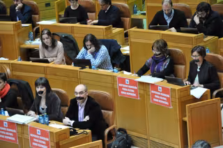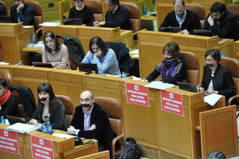 Tanto Jorquera como sus compañeros de grupo han permanecido en el hemiciclo en sus filas y han observado la sesión de control con cintas adhesivas en la boca simulando una mordaza. Además, han colgado ante sus mesas carteles de denuncia sobre la situación de Povisa bajo el lema: 'Despedidos readmisión. Povisa culpable. Sergas responsable'.