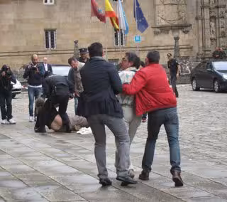 Cuando el vicepresidente de la Xunta y conselleiro de Presidencia, Alfonso Rueda, se disponía a acceder al Ayuntamiento compostelano, los dos detenidos se saltaron las vallas que limitaban el perímetro de la protesta, ubicado a unos 150 metros del Pazo de Raxoi, por lo que fueron perseguidos por agentes y uno de ellos fue reducido en el suelo.
