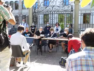 Representantes de los sindicatos CIG, CSIF, CC.OO. Y STEG, de los sindicatos estudiantiles Erguer y Anega y de las federaciones Confapa y Anpas Galegas en la lectura de un manifiesto frente a la Consellería de Educación. - CIG