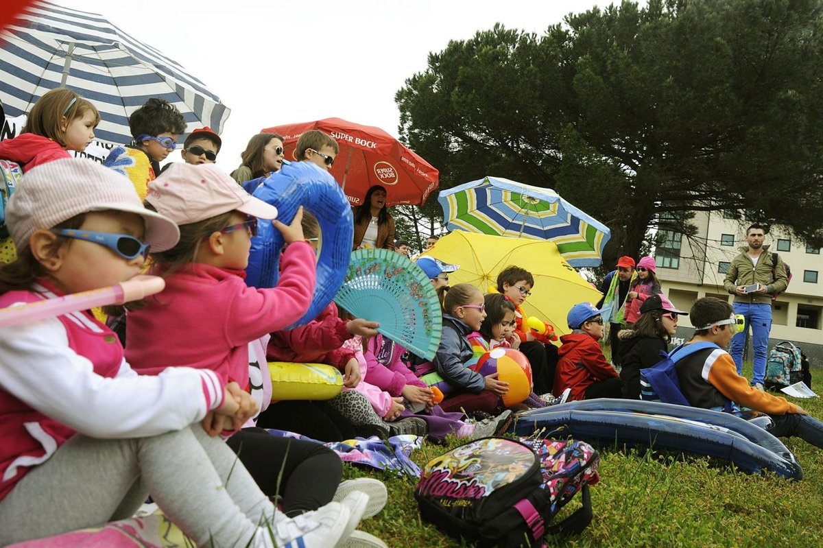 Medio centenar de escolares y padres del barrio de Os Rosais en Ourense han escenificado este jueves una playa ante el colegio en el que se registran temperaturas extremas desde que fue reformado con un presupuesto de 3,8 millones de euros en 2010, pues los materiales y estructura provocan, con la llegada de los días despejados, un recalentamiento de las aulas.