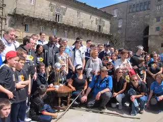 Terry Porter ha entrado en la Praza do Obradoiro junto con la primera plantilla del Obradoiro CAB, así como por aficionados, entre ellos muchos niños y adolescentes.
